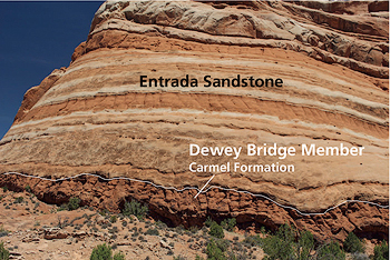 The fundamental unit in stratigraphy is a formation (like a species is in biology). Formations are commonly known as rock layers. At least here in canyon country where there is nearly 100% exposure of bedrock and there are rock layers with distinctive rock types, color, and other characteristics, formations can be widely recognized by hikers and travelers. Different layers form different types of landforms (cliffs or slopes), contain different suites of fossils (like the dinosaurs of the Morrison Formation), or are likely to host natural arches (like the Entrada Sandstone).