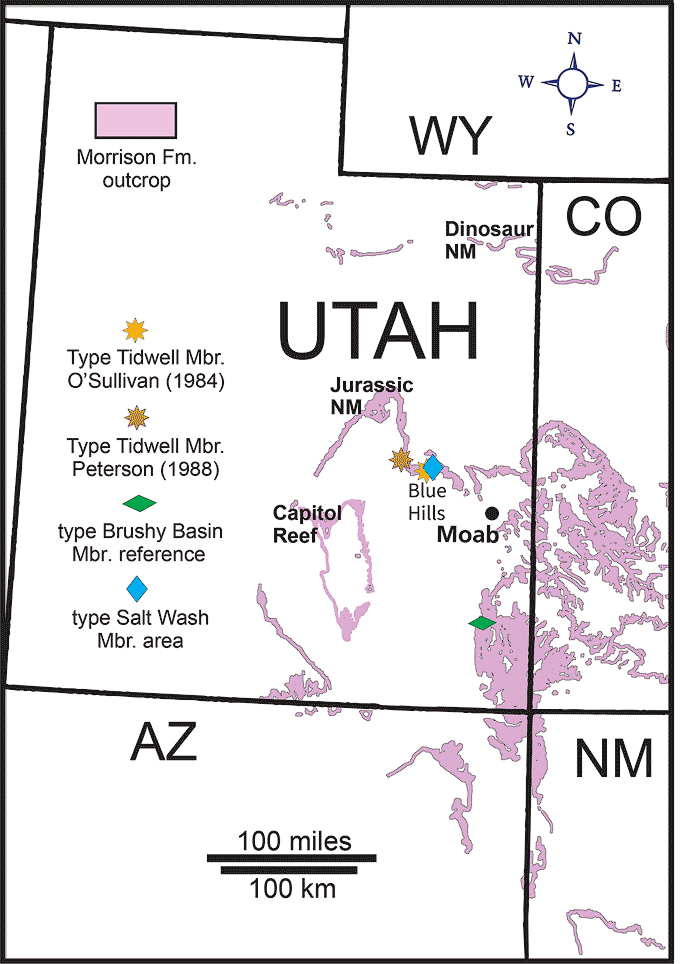 Map showing the outcrop area of the Morrison Formation and location of type sections for three of its members. Two researchers designated type sections of the Tidwell Member (named for Tidwell Bottoms on the San Rafael River). Modified from Figure 1 in The Morrison Formation and its Bounding Strata on the Western Side of the Blanding Basin, San Juan County, Utah by James Kirkland et al. Used with permission.