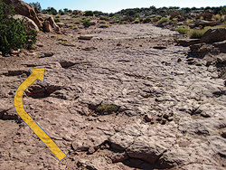 The sauropod trackway at the Copper Ridge Dinosaur Tracksite showing the turn to the right. The regular spacing between sauropod tracks, which are usually large round depressions, help indicate that they are trace fossils. Photo by James St. John. CC by 2.0