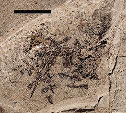 Regurgitate fossil from the Morrison Formation in southeastern Utah. Researchers think that this concentration of tiny frog and salamander bones was vomited by perhaps bowfin fish living in a pond as it was being pursued by another predator during the Jurassic. Note that the amphibian bones are body fossils, but the overall regurgitate is a trace fossil. Image courtesy of John Foster, Utah Field House of Natural History. Scale bar 5 mm.
