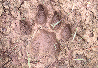 Both of these species have somewhat similar track patterns, which might be the best way to determine their presence. Unlike canid prints which show the claws, cats can withdraw their claws as they walk, thus they rarely show in a print. Plus, cat pads have a cleft on the leading edge of the pad and two on their rear end of the pad which looks like two bumps and three bumps, respectively, on the pad. Also, bobcat tracks are surprisingly small and cougar prints are quite large, and they both have a gait where the hindfoot and front foot almost overlap each other as the feline is walking.