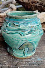 Savoie makes both wheel-thrown and hand- built ceramics, usually mid-range fired stoneware. She creates both decorative and utilitarian pieces that evoke the natural forces that have shaped our remarkable landscape. Describing her creative process, she says,”The geologic exposures of erosion by wind, water and fire create the textures, patterns, colors and possibilities for artistic expressions.” The earthy colors and textures and the unusual, playful shapes of her works are a visual and tactile delight.