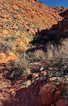 I walk through the willows and start up the several switchbacks, then traverse north across rock faces and down into and out of various gullies, the contours raggedly parallel to and above Highway 191. The trail is narrow, so a group will need to travel single-file, and exposure and loose rocks require careful foot placement. The trail then splits into high and low routes. On this brisk morning, I stay on the low route.