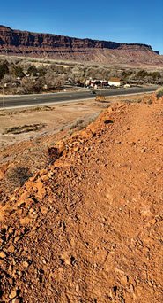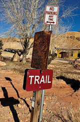 To get to Prospector, I drive north from Moab on Main Street/U.S. 191) to the rock shop (600 North) on my right/east and pull into a dirt lot lined by cottonwoods and willows about 200 feet north of the shop. The trail starts at a short bridge of Marston mat or matting, a modular pierced steel planking creating airstrips that supported Allied airpower in World War II. Prospector’s northern trailhead is at Raven’s Rim (998 North) parking area, just off the paved bike path. Be sure not to block access to either of these businesses.