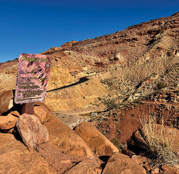In the summer of 1952, the Texas prospector and geologist Charlie Steen (1919-2006), discovered a particularly valuable form of uranium about 30 miles southeast of Moab: pitchblende, a black, dense, pitchy form of the crystalline uranium oxide mineral uraninite. As he developed his Mi Vida (“My Life”) Mine, a “Uranium Rush” of prospectors into the region soon followed, swelling Moab’s population from 1,200 to 7,000 in less than a year. (Moab’s current population is around 5,100.) The boots he was wearing when he made the discovery are on display at the Moab Museum. The Sunset Grill a reconfiguration of the Steen family home, also has a giant replica of the boots on display. In February, the Moab Museum opened “U92: Moab’s Uranium Legacy,” an exhibit that describes the effect this discovery had on our community and the world.
