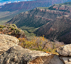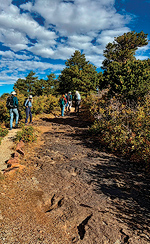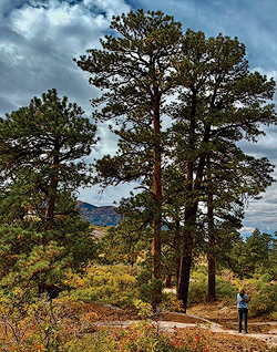On this brilliant, bluebird morning, the birders were at this overlook primarily to glass migrating raptors catching thermals rising up from the canyon. We saw golden eagles, sharp-shinned and Cooper’s hawks, and American kestrels; plus forest-dwelling warblers, mountain chickadees, sapsuckers, swifts, flickers, jays, nuthatches, bluebirds, and some curious ravens. (A special thanks to Mary Moran for doing the tallying.) We trained our binoculars on these living birds flitting among the Ponderosas and those wheeling above the canyon on spiraling air currents, their super-great-grandparents’ petrified tracks behind us. The buzzy dee-dee-dees of concealed chickadees serenaded our lunchtime on the rocks and the eventual reluctant walk back amid the fragrant detritus of pinecones and pine needles to cars and responsibilities..