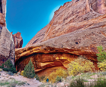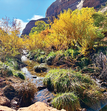 The National Arch and Bridge Society (NABS) calls Morning Glory an “alcove arch,” though some call it a bridge, especially when rivulets of rain water flow beneath it. It is 243 feet long, descends into the Medieval Chamber (a dark “hallway” only accessed by rope), with only a mere 15 feet separating it from the cliff. Morning Glory is the sixth longest natural rock span (including arches and bridges) in the United States. America’s longest span is Landscape Arch at 275 feet in Arches National Park. The world’s longest span is China’s Xiānrén qiáo (Fairy Bridge) at 400 feet. A canyoneering route from Sand Flats leads visitors to the top of Morning Glory. Beneath the arch, I joined admiring hikers from (as I learned) Washington, D.C.; Detroit; Salt Lake City; and Coloradans from Denver, Breckenridge, and Fruita. This gold-spangled canyon was Bill Grandstaff’s home for just a few years of his peripatetic life. As the cascading crooning of an unseen canyon wren serenaded my hike back, I wished Bill could somehow know what his luxuriant gorge means to visitors and high desert denizens alike.