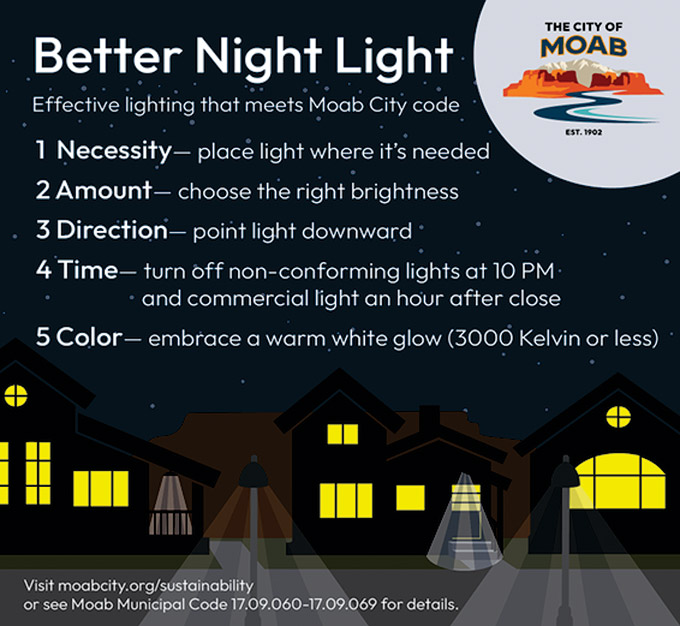 Those are five principles for outdoor lighting: necessity, amount, direction, time, and color. I hope this information will be helpful to you when you decide to replace or install outdoor lighting fixtures. All non-compliant outdoor light fixtures and bulbs must be replaced or brought into compliance by January 1, 2029. Finally, the Moab City code is the definitive source of information and your best resource for following the code. Thank you for reading!