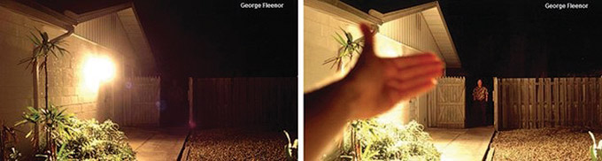 3. Direction: Is it hitting the target? Outdoor lighting must be directed downward and shielded to keep the focus on the ground, not the sky. Unshielded lighting creates glare. Glare reduces the visibility to see objects in the distance. Check out the images below. Camouflaged under the glare, you can hardly see the trespasser in the photo on the left. However, when the glare is blocked by a hand, acting like a shielded light, the trespasser becomes visible in the picture on the right. Reducing glare improves the visibility of the surroundings and reduces light trespass.