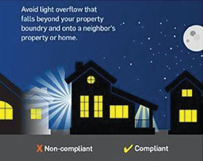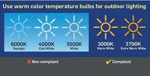 | What are code compliant light fixtures and light bulbs? Fully shielded and pointing downward directed lighting |