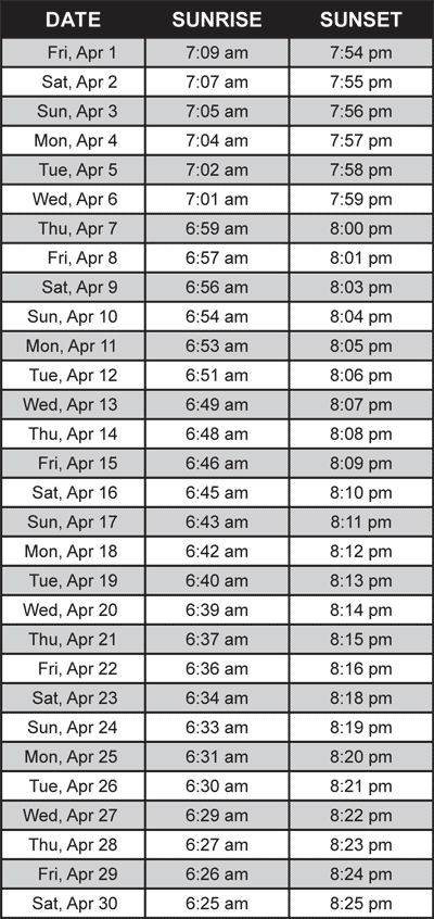 (The time of sunrise and sunset assumes a flat horizon. Actual time may