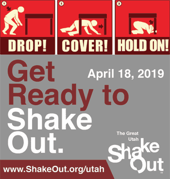 Because of the risk that exists from damaging earthquakes in the state, the Great Utah ShakeOut, an earthquake preparedness drill, will take place at 10:15 am on Thursday, April 18. 2019. During the ShakeOut, individual participants will practice how they will Drop, Cover and Hold On during a quake, and agencies, organizations, schools and businesses will take part in more extensive earthquake scenarios. Nearly a million people in Utah participated in the 2018 Great Utah ShakeOut. To learn more and to register for the 2019 event, visit https://www.shakeout.org/utah/.