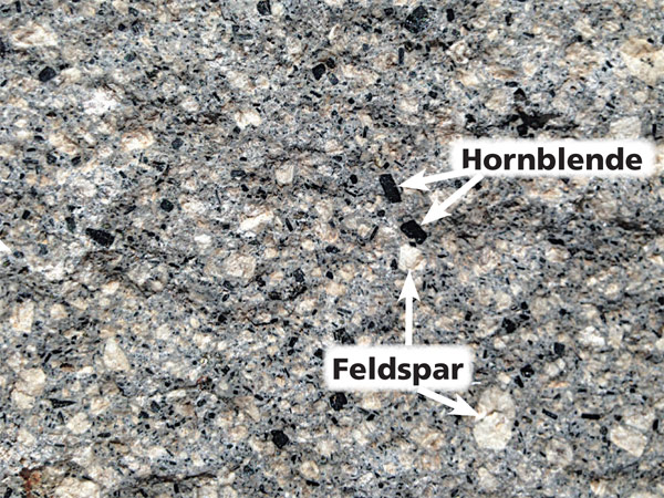 Igneous rocks are crystallized from melted or molten rock (magma). Magma can erupt at the earth’s surface, forming lava flows and volcanoes, but it also can be crystallized within the earth’s crust to become intrusive or plutonic rocks. Igneous rocks are crystalline, usually appearing very different from the sedimentary sandstones and shales found near Moab. The igneous rocks (generally a type of rock called diorite) in the La Sals are speckled in salt and pepper colors (with much more light-colored feldspar than black hornblende) with individual crystals sometimes reaching a half an inch in size.
