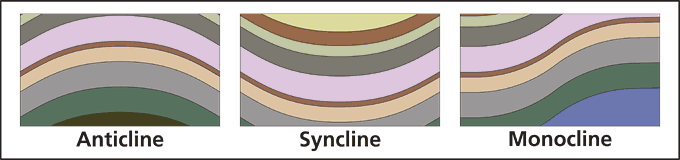 Anticlines and synclines make characteristic patterns as seen on the ground, although topography does not always follow the structural bend of the rock layers. Actually, the opposite happens often enough that geologists have a term for it: inverted topography to describe a valley that sits over an anticline or a highland situated over a syncline.