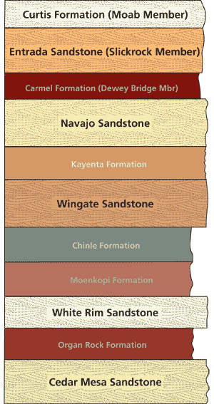 The White Rim, Cedar Mesa, Wingate, Navajo, and Entrada sandstones were all deposited in eolian systems as was the Moab Member of the Curtis Formation. (A member is a subdivision of a formation).