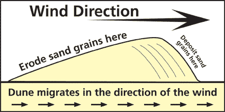 One of the most noticeable characteristics of eolian sandstones is the presence of cross bedding. Cross bedding is a type of layering within a layer (bed) that is at an angle to the main bedding. It forms as wind picks up sand on the windward side of a dune and transports it to the leeward side, where it is deposited, forming layers parallel to the moving dune surfaces.