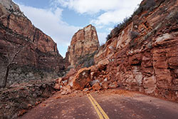 A rockfall in Zion National Park in 2017. Zion contains steep slopes and the Navajo Sandstone, one of the rock layers also found near Moab. It has a significant rockfall hazard similar to that in southeastern Utah. Courtesy of the Utah Geological Survey. |