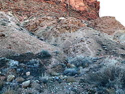 Paradox Formation caprock exposed near the Portal near the Kane Creek Road. The Paradox Formation here consists mostly of contorted gypsum left after salt dissolution. |