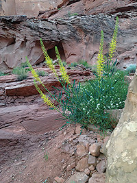 But life abounds throughout canyon country; growing and living among, on, and around the rocks. Anyone who has spent any time exploring the landscape near Moab begins to notice the relationships between plants and geology here. Some of the connections are obvious, such as groves of cottonwood trees growing along streams, and the unique plants found near seeps and springs. Others are more subtle as some plants grow on specific rock layers or soil types. Prince’s plume, for example, favors alkaline soils containing selenium, and big sage tends to grow only on flats with thick alluvial soils.