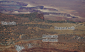 | Aerial photograph of the Island in the Sky showing the White Rim in the background. Areas with shallow soils are dominated by pinyon pine and juniper trees, whereas moderately deep soils support blackbrush, and grasses grow in areas of the deepest soils. Photo courtesy of Chris Benson. |