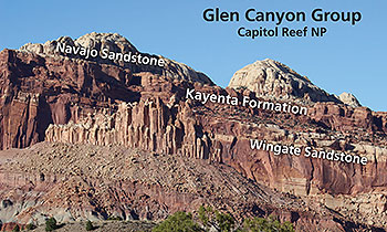 So while rock layers are individuals, sometimes they are also part of a larger grouping of rock layers—a geologic “family” if you will. These geologic “families” occur where the rock units share something in common. The Wingate Sandstone, Kayenta Formation, and Navajo Sandstone are three such layers. They are all part of the Glen Canyon Group, with group being the next higher stratigraphic rank above formation.