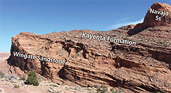Among the most prominent rock layers near Moab are three sandstone units: the Wingate Sandstone, the Kayenta Formation, and the Navajo Sandstone. Each has been defined as a formation in geology’s formal lithostratigraphic ranking system for naming sedimentary rock.