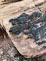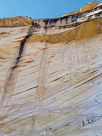 Sometimes desert varnish can form within a short time period. This rock face was exposed by a large rock fall in 1997. These water streaks likely consist of black fungi, heavy metal (iron and manganese) skins, silica glaze, and perhaps incipient rock varnish. NPS photo by Clayton Middleton. |