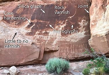 These mostly red to brown to black rock surface coatings are generally known as desert varnish in southeastern Utah, but they are usually complicated mixtures of several different types of rock coatings: rock varnish, case hardening, heavy metal skins, silica glaze, and others. (Note, this article uses the term desert varnish to indicate any dark-colored rock surface coating regardless of its specific type(s).)