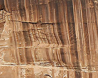 Most of the time when we look at the canyon scenery near Moab, it is not the color of the rock itself that we are seeing. Most of the sandstones that form the cliffs and slickrock domes found throughout southeastern Utah are light in color: off-white to tan or pink. But the darker colors of the rock surfaces are a large part of any view, whether they are the reddish-brown cliffs above Moab or the dark-brown to black streaks that paint many lighter-colored rock surfaces. Dark surface coatings are also integral to formation of petroglyphs—rock carvings made by chipping through dark surface patinas to expose lighter-colored bedrock.