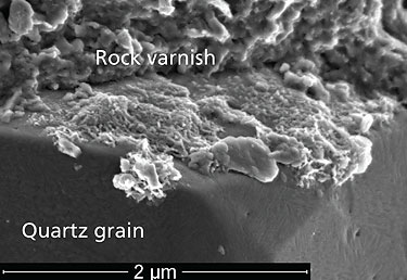 Electron microscope image of rock varnish beginning to coat a quartz grain. Photo courtesy of Ron Dorn, Arizona State University. |