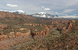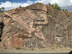 Young igneous rocks are found on and around the Colorado Plateau, including both intrusive (plutonic) rocks that crystallized underground and volcanic (extrusive) rocks that were erupted onto the Earth’s surface. The closest occurrences of igneous rocks are in the La Sal Mountains just east of Moab, which are igneous intrusions. The La Sals are mountainous both because magma (molten rock) was injected close to the earth’s surface so that it domed up the sedimentary rock layers that it intruded and also because the crystalline igneous rock is much more resistant to erosion than the surrounding sedimentary rocks so that it forms a topographic high.
