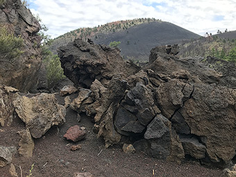 Part of a lava flow from Sunset Crater Volcano in front of the Sunset Crater cinder cone, a small volcano made up of fragments of volcanic rock that were blasted into the air and then fell around the vent..