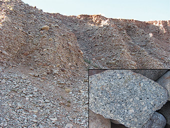 Streams flowing down from the La Sal Mountains carried cobbles and boulders of igneous rocks to Moab. This deposit of boulders is near the bowling alley (Gravel Pit Lanes). Almost every boulder is made of a igneous rock called diorite from the La Sals because these rocks are so much more durable than sedimentary ones. The close up shows the salt and pepper texture of the diorite with light-colored feldspar and dark hornblende crystals..