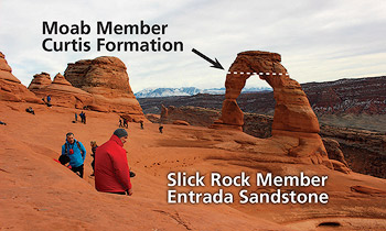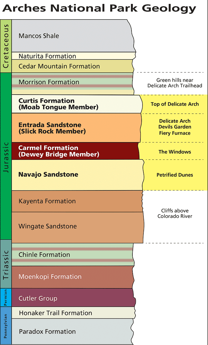 While also eolian (e.g., deposited in sand dunes) in origin like the Navajo, the Entrada Sandstone is also massive, meaning that it lacks pronounced layering within it. Therefore, the Entrada is more uniform than the other layers in Arches, which helps make it a good tableau for the weathering and erosional processes that carve natural arches. The fact that the Entrada is strong enough to hold up vertical cliffs and overhanging slopes while still eroding rather readily is also key.