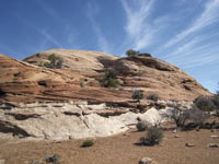 Soon after that structure, the sloping, sandy trail now switches to long stretches of slickrock that wanders past potholes and several impressive domes. I particularly like the pocketed shelters within the slickrock walls that have created a refreshing pinyon pine, juniper tree and cliffrose Garden Of Eden.