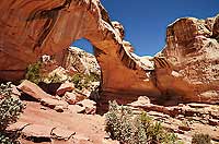 The trail is not difficult to follow, but you will have to rely on rock cairns to guide you through certain sections. Eventually the trail brings you into the bottom of a wash, where you’ll pass a small natural bridge. (Kids love to play in the sand under this mini bridge, so if you’re hiking with children, be prepared for a delay here). After climbing out of the wash, you’ll soon reach a spur trail on the left, but continue straight on the main path to reach the base of the bridge.