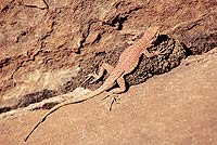 Another large lizard in the region is the collared lizard, a spectacular contrast of colors with a yellow head, black neck bands, and turquoise body with yellowish spots. A unique attribute of the collared lizard is its ability to stand up and run on just its hind feet while chasing after grasshoppers, other lizards, or fleeing from a predator. This bipedal motion inspires a vision of a miniature T-rex.