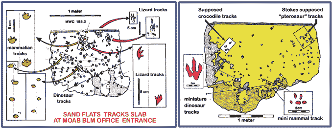 | The twin Sand Flats track slabs found by Moab resident Lin Ottinger are evidence of the activity of abundant, small, Early Jurassic mammal relatives and bird-sized dinosaurs, as mapped and published by the author in various sources. The interpretation of some tracks as crocodilian or pterosaurian has been refuted. One slab is on display at the BLM office. |