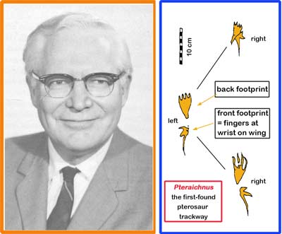| William Lee Stokes, famous Utah Geologist, discovered the first pterosaur tracks ever discovered from Late Jurassic rocks in the Four Corners area. They proved that pterosaurs walked on all fours. The alternate crocodile trackmaker theory proved wrong. Portrait courtesy of Utah Geological Survey. |