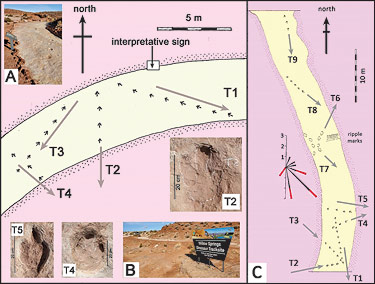 | Maps of the dinosaur tracksites at Willow Springs that from part of the Moab megatracksite. Note that trackways (T1-T4 etc.,) made by individual animals are easy to identify. |