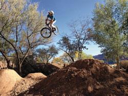A few minutes on a bike will make any day better. Tucked away on 500 West and Williams Way, Moab City hosts a great little bike park at Anonymous Park with a pump track and jumps that you can hit on the way to work, on your lunch hour, after dinner… whenever you have a few minutes to ride. Riding at the Moab Bike Park will improve your bike handling skills, give you a workout, make you laugh and doesn’t require that you wear Lycra. Don’t worry if you are over 15 and don’t have any skinny jeans… this is the place where everyone can go to work on their skills and watch some amazing riding.