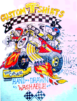 on his custom T-shirt designs. Occasionally, a cartoon of