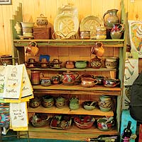 Brilliantly colored hand-made pottery glints on the shelves in bold colors, decorated with petroglyphs and other southwestern patterns. Unusual creations such as a sponge holder with its own tray stand out in a collection from a Colorado studio. Nearby are intriguing flame pots and iridescent raku dreamcatcher jars, ceramic lizards, coasters, trays and more.