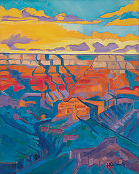 Culbreath says she has been an artist all her life, taking numerous workshops and experimenting with different mediums including watercolor, acrylics, and inks before finding her medium of choice in oils. Her earlier work was a realistic portrayal of the landscape. More recently she has changed her palette and is painting in a more impressionistic, bold and colorful style, reminiscent of Maynard Dixon and Ed Mell in its simplicity and boldness. She says, “ I see my work changing over time by becoming less hindered by capturing exactness in a scene but allowing the viewer to fill in what they know to be there.”