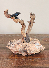 It all started with those beautiful and sometimes silly birds that we met along the way, the raven. We learned to love ravens and decided it would be fun to honor them with a tribute. As we studied them and about them, we found that they have a rich and varied presence in mythology and folklore across cultures, often embodying complex symbolism ranging from wisdom and prophecy to death and trickery. Their black feathers and carrion-eating habits tied them to death and the supernatural, while their intelligence earned them respect as messengers or guides. So, with our collected sticks and stones, we present to you wall hangings and dioramas of ravens. All pieces of rock, stick and bone were found on trails around Moab. The representative ravens are 3-D printed resin, in various ratios, then painted with acrylics with an iridescent application to make them realistic. Please enjoy! “