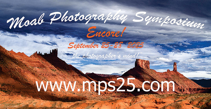 Moab Photography Symposium 2025 is scheduled for September 25-28. Attendance is by pre-registration only and is limited to 63. MPS25 features a keynote by Colleen Miniuk and Last Word by Guy Tal. In between there are 6 feature presentations by Charlotte Gibb, Jennifer Renwick, David Kingham, Michael Gordon, Chuck Kimmerle and Bruce Hucko. Each presentation by these noted artists will concentrate on developing your personal vision and artistic philosophy with the guiding theme being “Inside the Photographer’s Mind.” Field workshops to sites on area BLM lands happen in the afternoon. They concentrate on technique, the elements and principles of art and composition. PhotoJAM is the two-evening event where participants show their work and everyone enjoys beverages and pizza! New for this year is the Group Picture Processing Soiree on the final morning and an ongoing Collectors Corner where everyone is invited to bring prints to trade or sell. The main event is complemented by the Terrific Trio Workshop taught by Miniuk, Kimmerle and Hucko starting the Sunday before. This is a more intense experience for 15 participants.