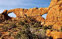 Turret is a stand-alone arch west of the Spectacles with its sidecar rock tower, looking like the turret of some desert castle. From this castle, you look east to the La Sal Mountains, sculpted in alabaster from our generous winter snowstorms. The “spectacles” are the arches of the North and South Windows, connected by the Nose Bridge band in the same sandstone fin. On the eastern side of the specs, you also enjoy pinyon pines, Mormon tea, and cheery calls of rock wrens.