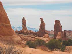 The eerie, other-worldly formations of Arches National Park began their birth process three hundred million years ago - way back when a large sea invaded the Colorado Plateau. As time went on the sea evaporated, depositing huge layers of salt thousands of feet thick. Residue from recurring floods, incessant winds and the rhythmic cycle of ingoing-outgoing oceans persistently covered the original bed of salt and the left- over debris was compressed into rock, possibly as thick as one mile. The tremendous pressure made the salt bed unstable. It consequently shifted, buckled, liquefied and changed position, thrusting the layers of rock upward into domes while other large sections fell into cavities. Surface erosion stripped off the layers around the young rocks. Water seeped into the cracks and froze, and the expanding pressure broke off bits and pieces leaving behind freestanding fins. Then wind and water attacked until the cementing material gave way and chunks of Entrada Sandstone fell out leaving behind the famous arch structure that gave the park its name.