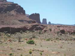Starting at the informational signs this, “for-hikers-only” trail immediately crosses the highway. After a short distance on a sandy trail through the stubby plant growth of greasewood, it splits and the loop begins. The suggested direction of travel is to go right to get better views of Castle Rock, the Priest and Nuns formation and the backside of Fisher Towers. Soon, you will be so close you can touch two distinctive rock formations that have an engorged, pregnant look. At that point, there is an optional left hand turn to a viewpoint of the river corridor and Hittle Bottom. Since it’s only 150 feet out of the way, why not take it and enjoy the view?