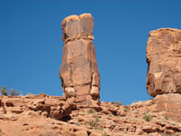 A dark rock tower next on your itinerary rises on your left, presenting you with a choice. For you can approach the south entrance of Jeep Arch by walking up and around this landmark on either side. We, however, chose an alternate, and in my opinion, an easier route that pursues a northly course by keeping the rock tower to the left. At this point continue on to the next mammoth rock mesa to pick up the well-used trail which will take you to the north entrance of the arch.